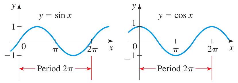 A function \(f\) is periodic if there is a positive number \(p\) such that \(f(x+p)=f(x)\) for every \(x\). The least such \(p\) is called the period of \(f\). The sine and cosine functions have period \(2 \pi\), and the tangent function has period \(\pi\).