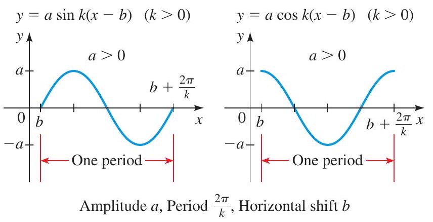 An object is in simple harmonic motion if its displacement \(y\) at time \(t\) is modeled by \(y=a \sin \omega t\) or \(y=a \cos \omega t\). In this case the amplitude is \(|a|\), the period is \(2 \pi / \omega\), and the frequency is \(\omega /(2 \pi)\).