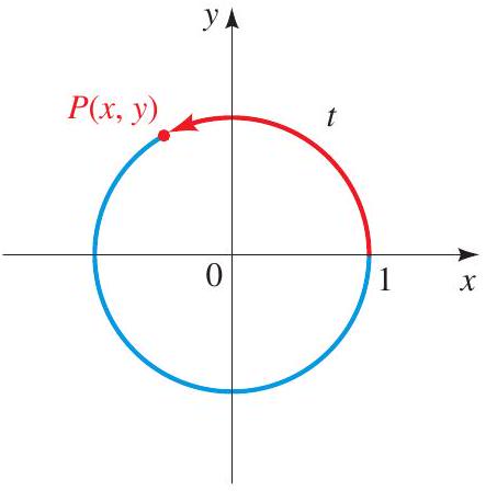 The terminal point \(P(x, y)\) determined by the real number \(t\) is the point obtained by traveling counterclockwise a distance \(t\) along the unit circle, starting at \((1,0)\).