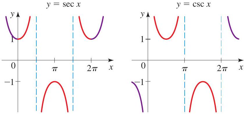 To graph one period of \(y=a \sec k x\) or \(y=a \csc k x\), an appropriate interval is \(\left(0, \frac{2 \pi}{k}\right)\).
